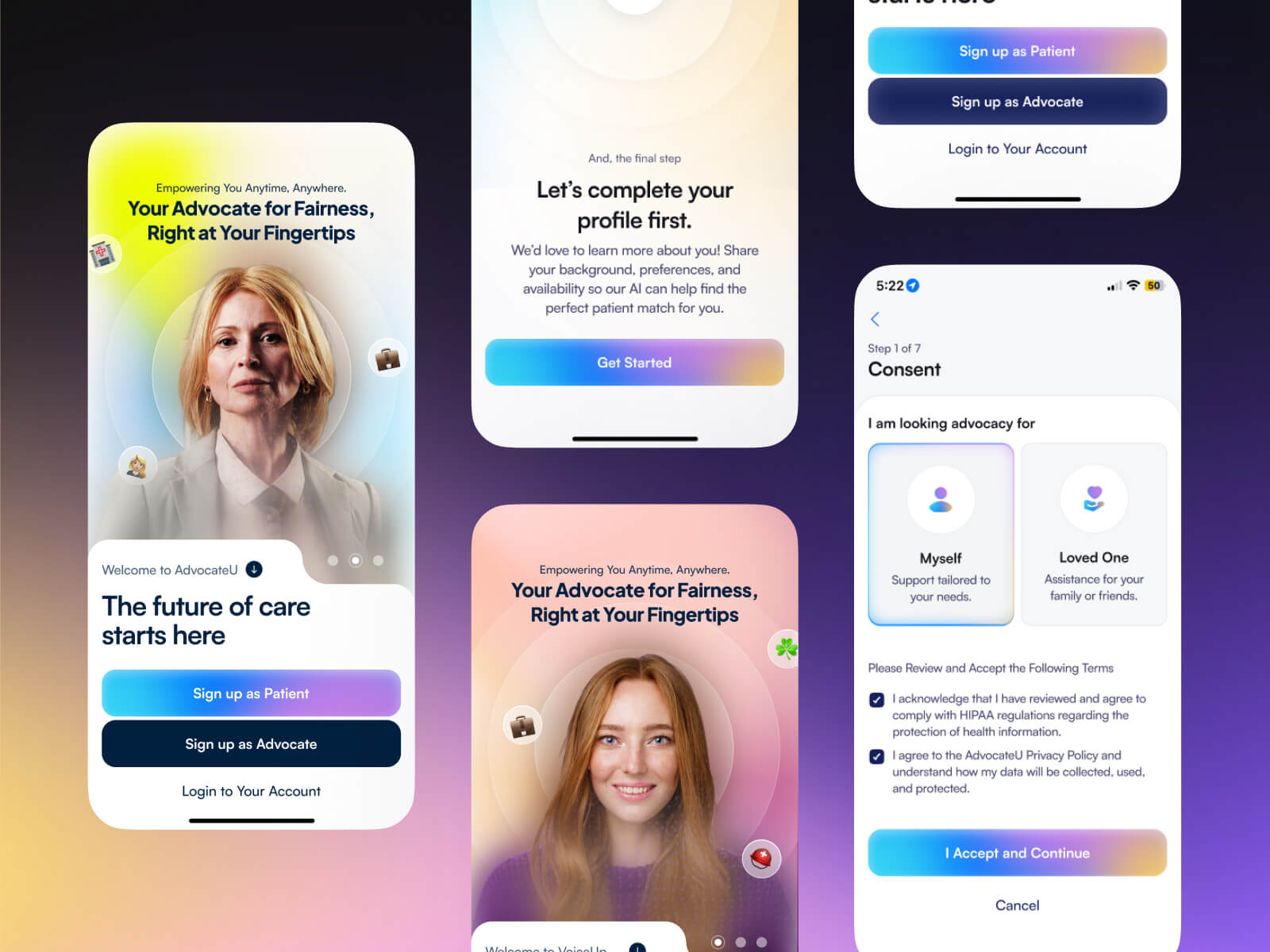 I led the design of Advocase, a platform that helps patients find legal and insurance advocates during critical healthcare moments. Alongside core advocacy features, I also designed tools for financial aid recommendations and verified crowdfunding — focusing on clarity, trust, and accessibility throughout the user journey.